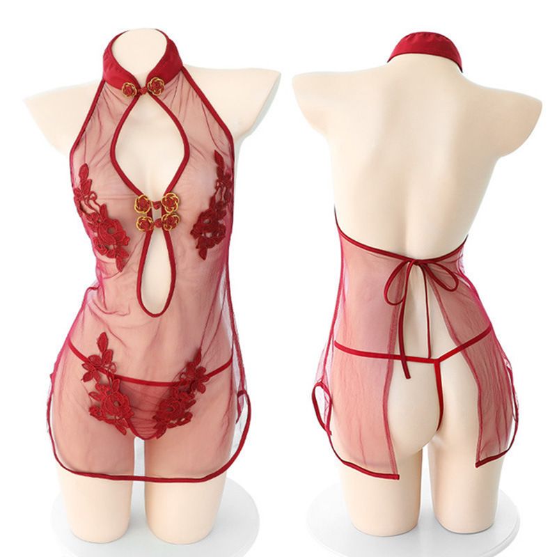 (情趣内衣)古典刺绣旗袍套装 (红色)